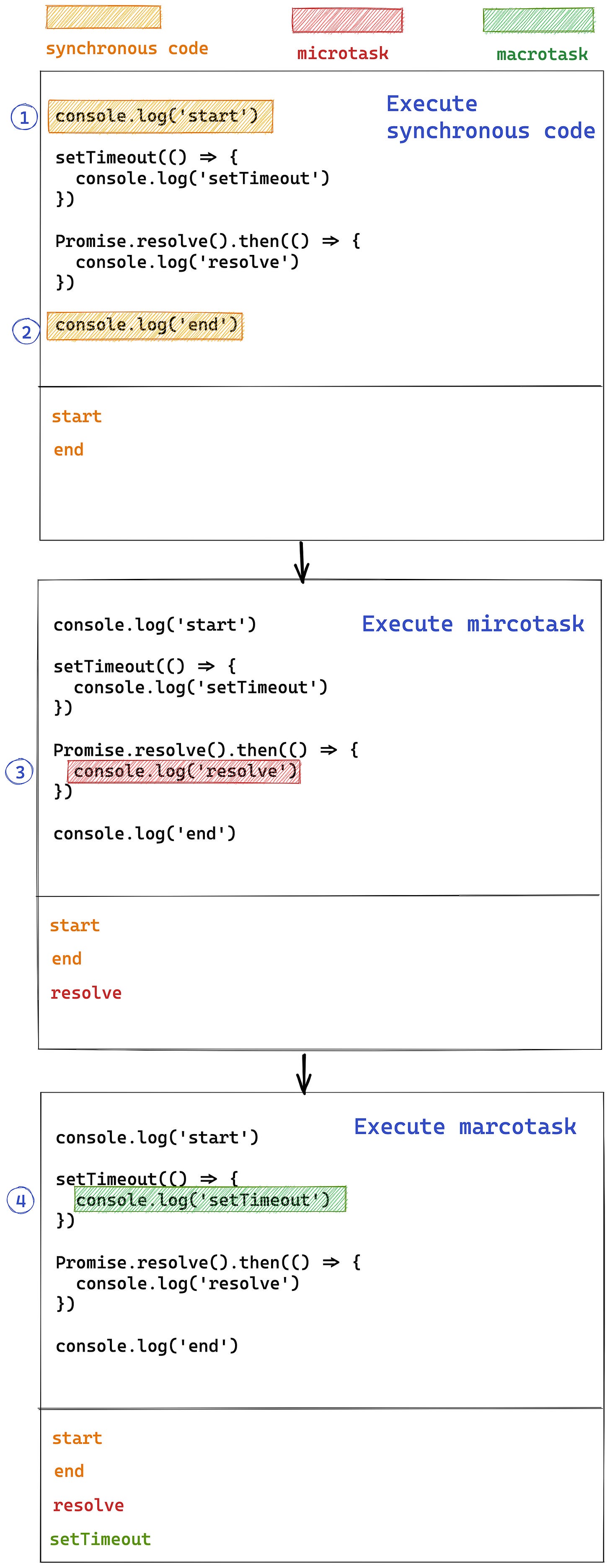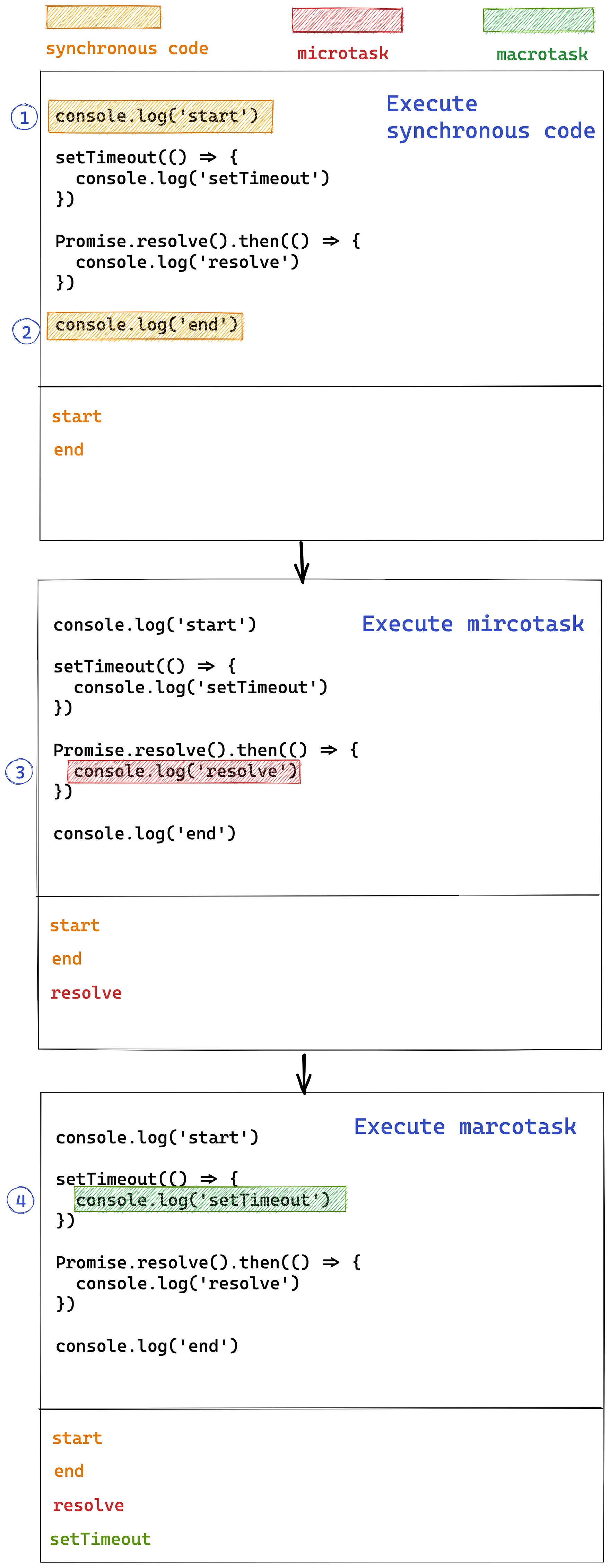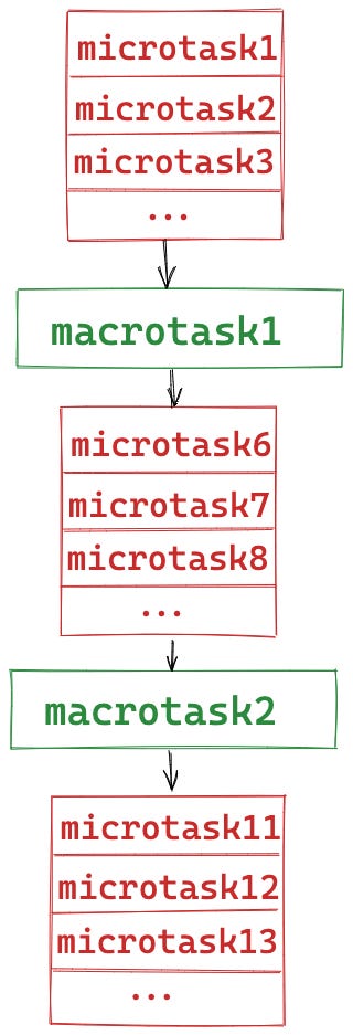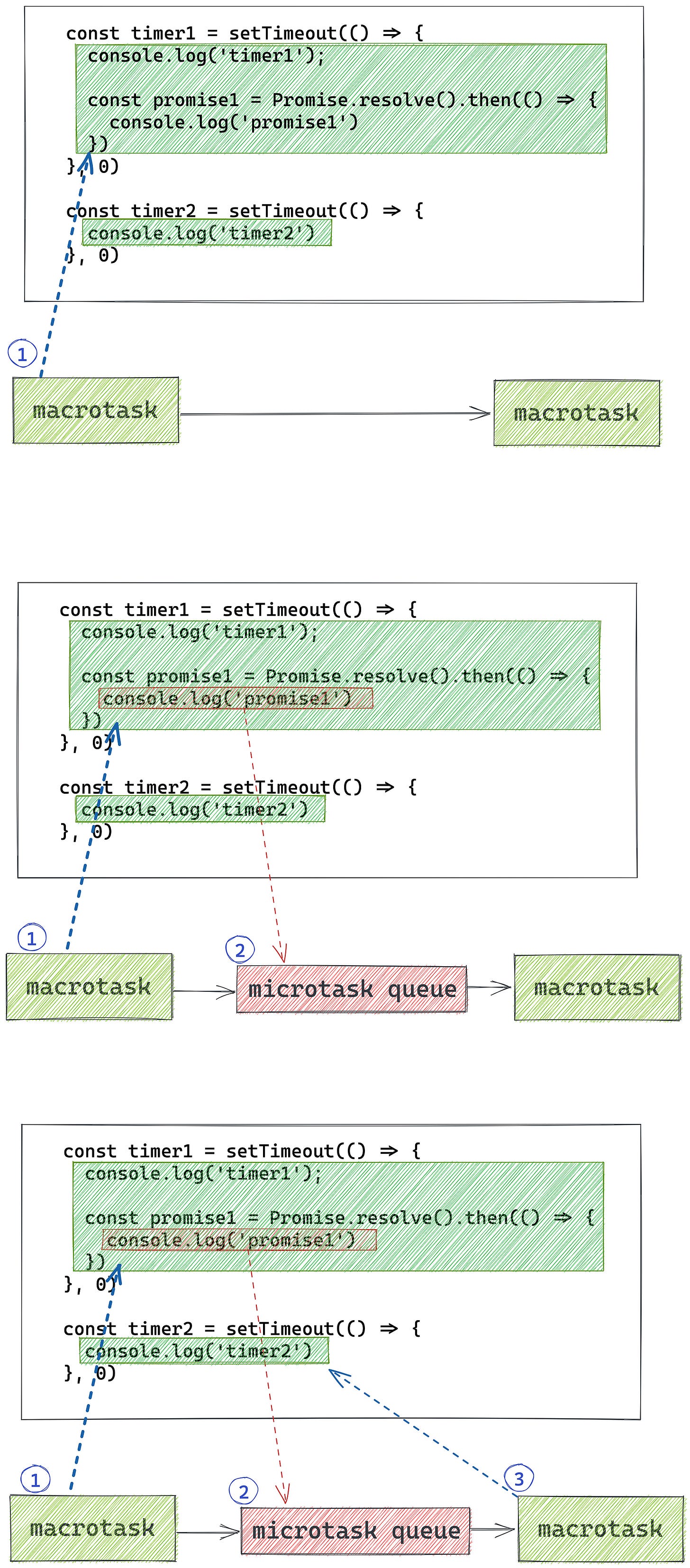Before we introduce the priority between microtasks and macrotasks, here we look at the case of alternate execution of microtasks and macrotasks.